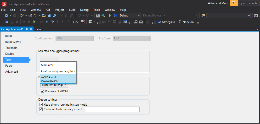 Rozwijamy listę wyboru i wybieramy podłączony programator wspierający platformę Atmel Studio 7.0. W moim przypadki jest to AVRISP MKII.